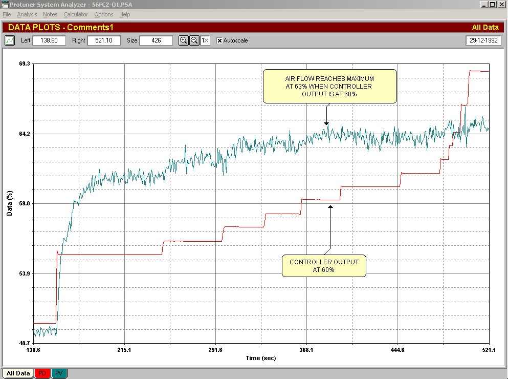Figure 2 is taken from an open loop test on an airflow in a brewery. It shows the flow responding well as the PD is increased. However after a certain point the flow changes in relation to the PD changes get smaller, until further changes in PD produce no flow increases at all. It is fairly obvious that the pressure in the line is insufficient to allow any more flow.