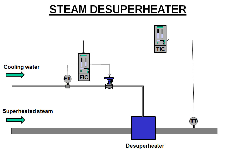 Figure 1 illustrates the recommended basic control configuration for a direct heating steam desuperheater. As can be seen the outlet temperature of the steam is controlled using a simple temperature to flow control cascade system. The purpose of the flow secondary control is to ensure that the correct mass of water is injected into the desuperheater. The flow loop responds very much faster than the temperature loop and thus it effectively eliminates all problems such as valve faults and water pressure variations that would seriously affect the temperature control.