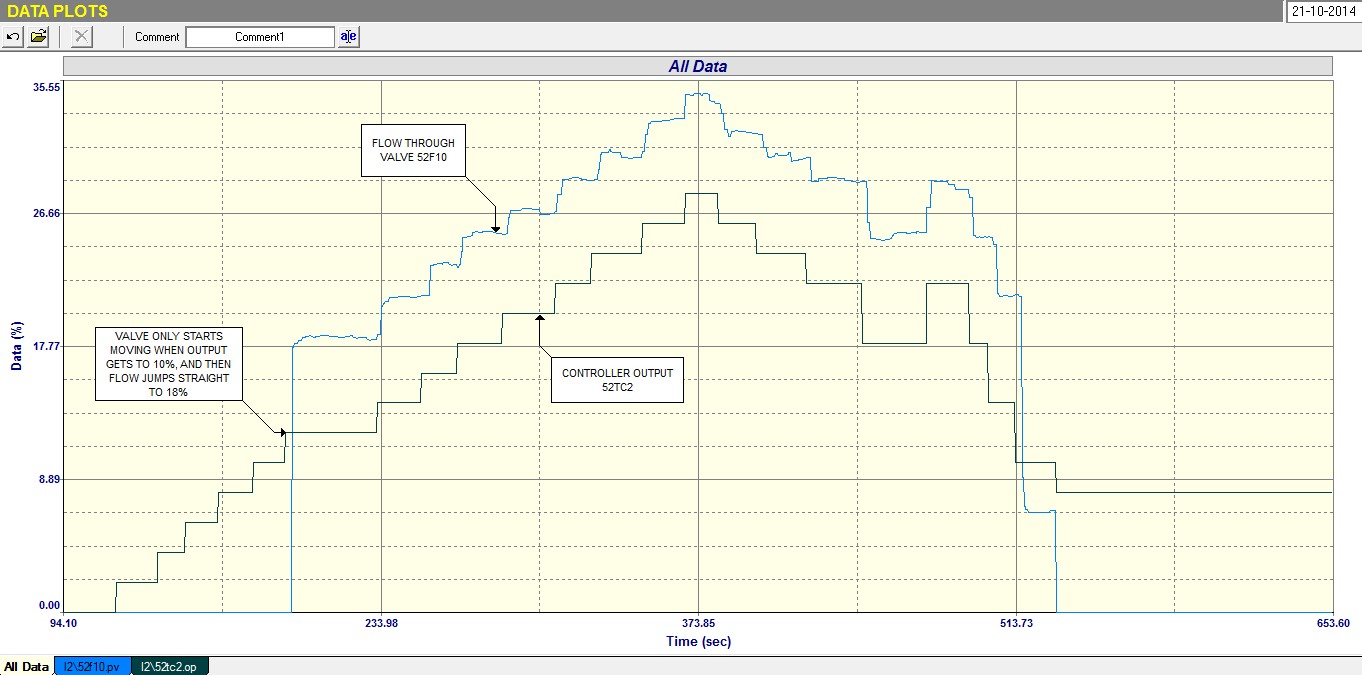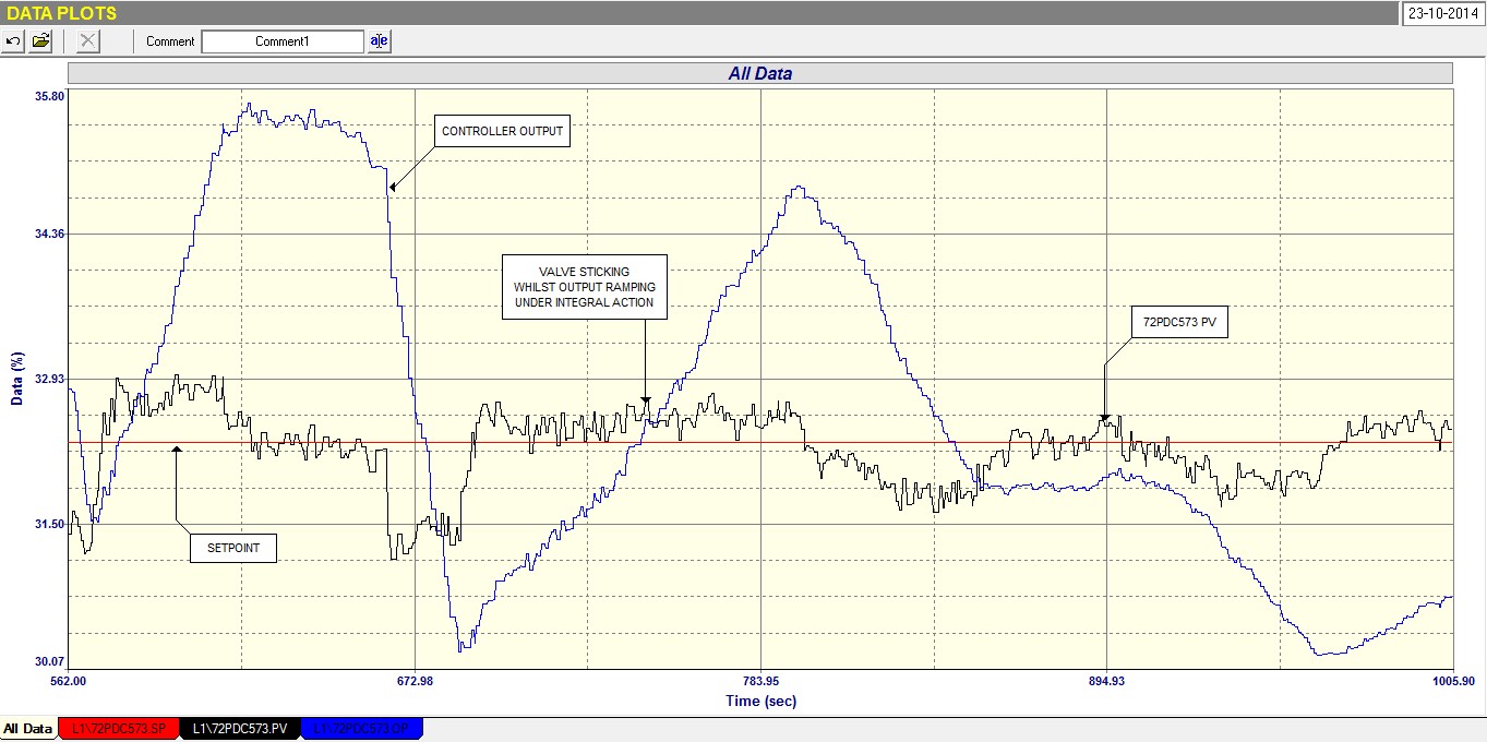 Figure 3 shows part of a closed loop test performed on the loop, where the setpoint is being held constant. It can be seen that the controller is battling to keep the PV on setpoint, and is ramping up and down in a type of saw-tooth wave, whilst the PV seems stuck at times and the jumps to a new value on either side of setpoint. This typical of stick-slip cycle, where the valve sticks, and the integral action in the controller starts ramping as it attempts to get the PV moving. Eventually there the actuator has sufficient energy built up in it to overcome the valve stiction and it results in the valve moving. However there is now so much energy in the actuator so that the valve overshoots setpoint. Then the cycle reverses.