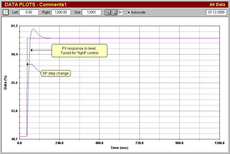 Figure 5 illustrates a typical example of an "as found" level control response to a step change in setpoint, and figure 6, the response on the same loop after proper tuning for "tight" control. It should be noted that not all levels are tuned this way, as in some processes the level control is detuned to prevent the control valve from moving around too much, but this is the subject for another discussion.