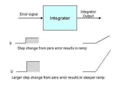 The error signal is fed into the input of the device. If the error is zero the output of the integrator remains fixed at whatever its current value is. However if an error does appear at the input, then the unit starts integrating the error value with time. Thus if the error input is a step, as shown in the figure, the output of the integrator will be a ramp, the slope of which will remain constant for as long as the error remains constant. If the error input is a larger step (bigger error) then the ramp will have a proportionally steeper slope. (It is important to note that the integral action in a controller is therefore greater, the larger the error. Conversely, as the PV gets closer to setpoint, so the integral ramp rate, and hence effect on the PD, will be much less.)