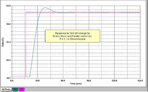 Thus the Parallel algorithm makes life extremely difficult for the poor instrument specialist, as tuning is made very much more complicated, as one has to adjust all the parameters simultaneously. On the Series or Ideal algorithms on self-regulating processes, once you have got the correct I (or I + D) settings, then you can leave those terms alone and play only with the P "knob" to obtain the desired response.