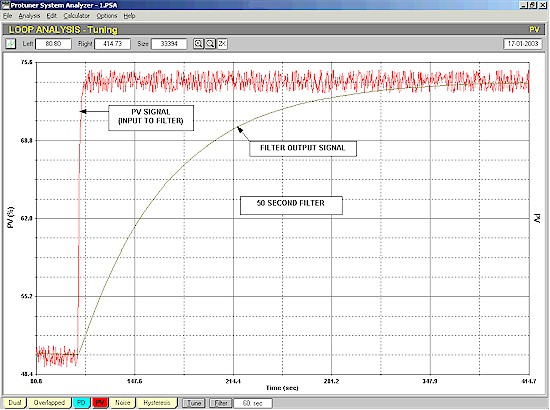Normal filters used in process control have a first order lag type dynamic, which is generally preferable to time averaging filters. This is because PID controllers can handle lag dynamics better. A lag type filter is also referred to as a low pass filter, as it passes the lower frequencies and attenuates higher frequencies components. Visually the filtered signal appears to have less noise. Obviously the greater the filter constant, the smoother the output signal.