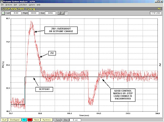 The controller has a filter with a 50 second time constant in it. The controller is extremely well tuned. The recording is made with the Protuner analyser connected at the input to the controller (upstream of the filter). A 10% step change in setpoint is followed by a 10% step change in load. An enormous overshoot on the PV response to the setpoint change can be seen. It is really bad. The load change however is controlled well. The controller brings the process back to setpoint speedily with little overshoot. This is in fact really good. (It also shows you can indeed get quite good control even with a big filter.)