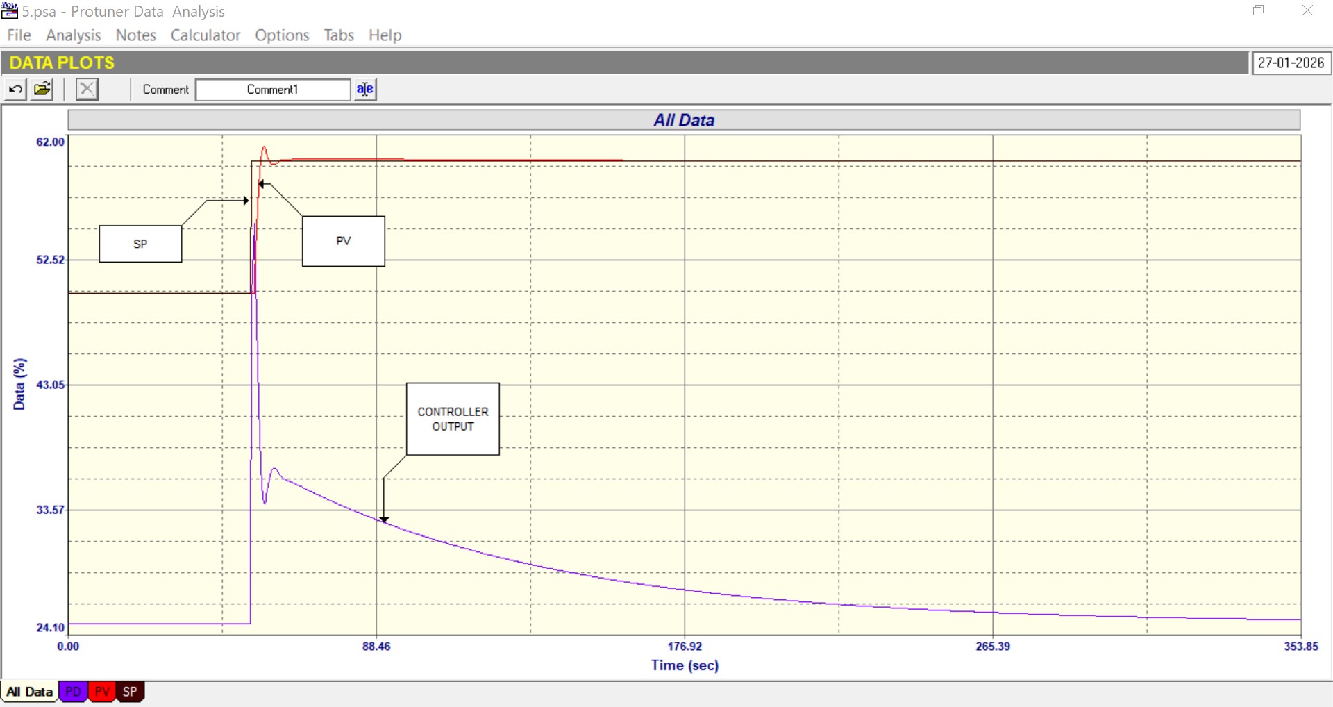 Figure 1 shows a closed loop test performed on a steam drier at a paper plant with the “as-found” tuning. It shows the response of the steam pressure to a step change in setpoint. It is very slow with quite a large overshoot, and it takes a long time for the process to get back to setpoint. As will be seen later it is far from satisfactory and would not follow the setpoint signal sent from an advance controller at all well.