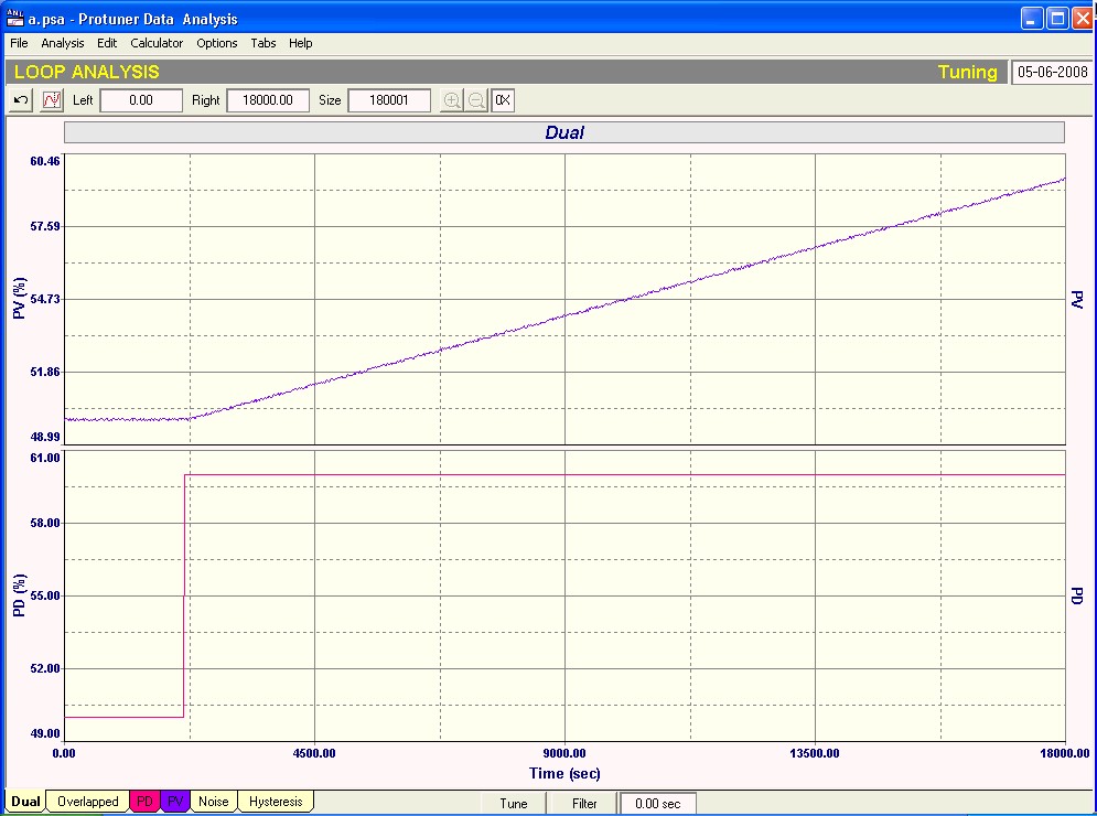 The loop for which the open loop test was performed as shown in Figure 1 was tuned with normal tuning criteria. The Protuner gave a Proportional Gain of 11, and an Integral setting of 7,378 seconds/repeat.