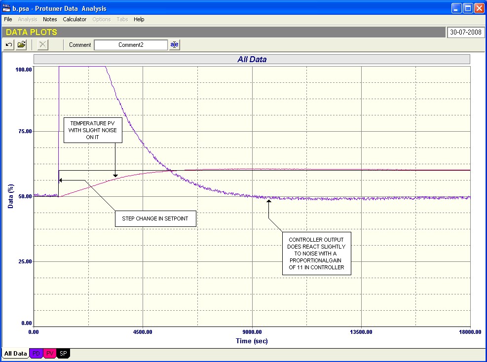 A closed loop step test with these parameters is shown in Figure 2. It can be seen that the response to the step change in setpoint was quite good with a slight overshoot that took along time to recover. (Remember from Loop Signature P2-16, that using the I term on an integrating process will always result in overshoot on setpoint step changes). In addition there was a tiny noise of 0.1% amplitude on the temperature PV signal. This does slightly affect the PD output as it is amplified through the Proportional gain factor.