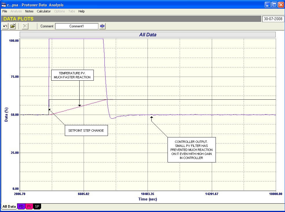 2. It should be noted that even with a very tiny noise on the PV signal (which is normal for temperature signals due to the large inherent filtering effect provided by the thermowell), a high gain in the controller can cause the valve to start jumping around, as the noise will be amplified by the gain and will appear on the output of the controller. This may shorten the life of the valve. In a case like this, a filter (which should be as small as possible) can be placed on the PV to dampen the noise.